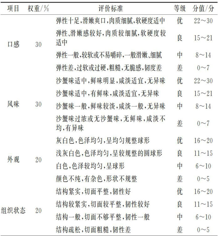 摘要:在猪肉丸制作过程中以大豆分离蛋白、木薯淀粉替代脂肪或减少脂肪的添加量,使得产品形成咸鲜风味,提高沙蟹汁的应用价值。该研究以沙蟹汁添加量、肥膘添加量、木薯淀粉添加量、大豆分离蛋白添加量作为影响因素,采用单因素实验、正交实验和模糊数学法对沙蟹风味猪肉丸的配方进行研究。结果表明,以 70g 瘦肉为基准,添加沙蟹汁 2% 、肥膘 15% 、木薯淀粉 3% 、大豆分离蛋白 2% 制作的猪肉丸富有光泽、弹性、咀嚼性,其综合感官评分为89.6分,产品较传统肉丸减少了 10% 的脂肪添加量,且产品具有浓郁的沙蟹风味,为丰富猪肉丸的种类及含沙蟹汁产品的研发提供了参考和理论支持。