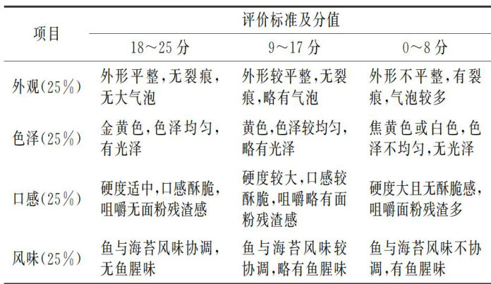 摘要:为丰富黄鱼产品的形式以及开拓健康绿色的休闲膨化零食领域,文章制备了一种非油炸黄鱼脆片。通过单因素实验对非油炸黄鱼脆片的感官评分、质构特性、色度进行分析,探究淀粉种类、淀粉添加量、海苔粉添加量、烘烤温度和烘烤时间对非油炸黄鱼脆片品质的影响,并在此基础上通过正交实验优化了制备工艺。通过正交实验设计进行优化后,得到各因素对脆度影响的大小顺序为淀粉添加量>烘烤时间 > 烘烤温度。结果表明,最优的非油炸黄鱼脆片制备工艺为以黄鱼鱼糜的质量为基准,淀粉添加量 30% 、海苔粉添加量 4% 、烘烤温度 120°C 、烘烤时间 60min ,在此工艺条件下感官评价和色泽最佳,硬度和脆度适宜,咀嚼无残渣感,口感酥脆。该研究为丰富黄鱼产品种类提供了一定的理论参考。