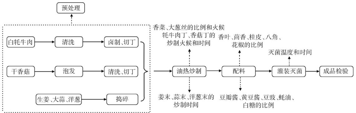 摘要:香菇耗牛肉麻辣酱作为一款多元化的调味品,不仅能够有效提升食欲,而且具备延缓衰老和强化免疫力的显著效果。相较于传统的香菇牛肉酱,该研究创新性地选用富含氨基酸、胡萝卜素、钙、磷等多种微量元素且低脂高蛋白的耗牛肉作为主要原料之一,与干香菇共同打造出独特的口感与风味。为研制出最佳口味的香菇耗牛肉麻辣酱,采用单因素试验深入探索了干香菇与卤耗牛肉的配比、七星椒与灯笼椒的配比、花椒精油与豆瓣酱的添加量以及卤牦牛肉丁和香菇丁的炒制时间等关键因素。通过主成分分析发现,七星椒与灯笼椒的配比、花椒精油添加量、豆瓣酱添加量对于塑造这款酱料的风味起到至关重要的作用。为进一步优化这些核心因素,进行了响应面优化分析,得出了最佳的配比方案:七星椒与灯笼椒的配比为 6.5:3.5 ,豆瓣酱添加量为 8.6g ,花椒精油添加量为 0.22g 。同时确定了干香菇与卤牦牛肉的最佳配比为 7:3 ,卤牦牛肉丁的炒制时间为 9min ,香菇丁的炒制时间为 16min 。在此最佳配比下,香菇牦牛肉麻辣酱的感官评分达到最高,酱料质地均匀,麻辣鲜香,菇香四溢,口感绝佳,为消费者带来了全新的味蕾体验。