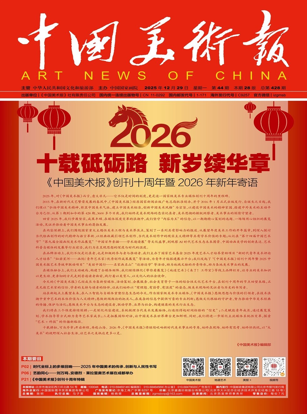 《中国美术报》成立于2015年12月26日,是文化和旅游部主管、中国国家画院主办的国家级美术专业媒体。2015年1月,由国家新闻出版广电总局批准创办,2016年1月正式出版。报纸的国内统一连续出版物号为CN11--0292,国内邮发代号为1-171,海外发行代号为C9257,篇幅为4开20版,彩色胶印周报,逢周一出版。