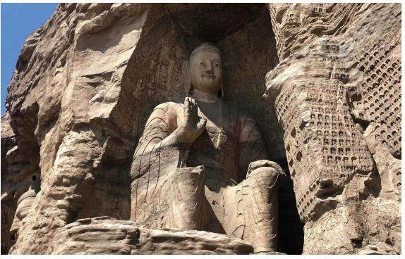 1 你们好,我是云冈石窟第19窟西耳洞的坐佛,有人叫我“拍手佛”,也有人叫我“击掌佛”,来过云冈的人,想必记得我。 从北魏和平年间(460—465)开凿云冈石窟算起,1500多年过去了,我就这么端坐在武周山的崖壁上,挺腰直背,面带微笑,不言不语、不悲不喜,右手高高举起、掌心向外,左手下垂,自然搭于膝上。我看过了古人,也看到了今人,而袈裟卷起的道道褶皱,还有当年工匠们雕凿时留下的虔诚。 尽