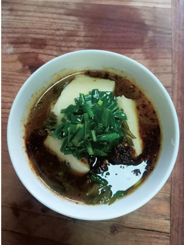 我的家乡安徽淮南位于八公山下,这里气候适宜、水土丰美、物产丰富,民间美食数不胜数,最有名的当属八公山豆腐。 在一个周六,我和家人开车回到老家,当时已经到了中午,我们便来到八公山南麓的一个小饭馆用餐。因为这里靠近有名的豆腐村,豆腐菜十分有名,所以我们点了好几道该店的主打菜。 首先上来的是一碟最简单的凉拌豆腐,店家只用了细盐、几滴酱油与一圈小磨麻油,佐以些许碧绿的葱花。只见那豆腐卧在青花瓷碟里,白