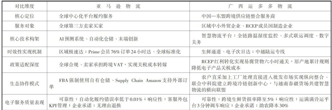 摘要:文章以亚马逊物流与广西运多多物流为双案例,对比研究跨境电商物流服务质量的差异化发展路径。研究发现,亚马逊依托“技术中心化”模式,通过智能履约矩阵实现 76% 订单当日达,但其标准化流程面临成本高、灵活性不足的挑战;广西运多多则通过政策生态融合范式,借力RCEP规则构建中国—东盟陆海联运冷链通道,将生鲜货损率降至 5% 并降低农户物流成本 30% ,但服务半径有限。文章揭示了电子服务质量的双元演化逻辑:全球化场景重技术密度与标准化,区域化场景重政策适配与产业整合,为跨境电商企业提供了差异化策略参考。