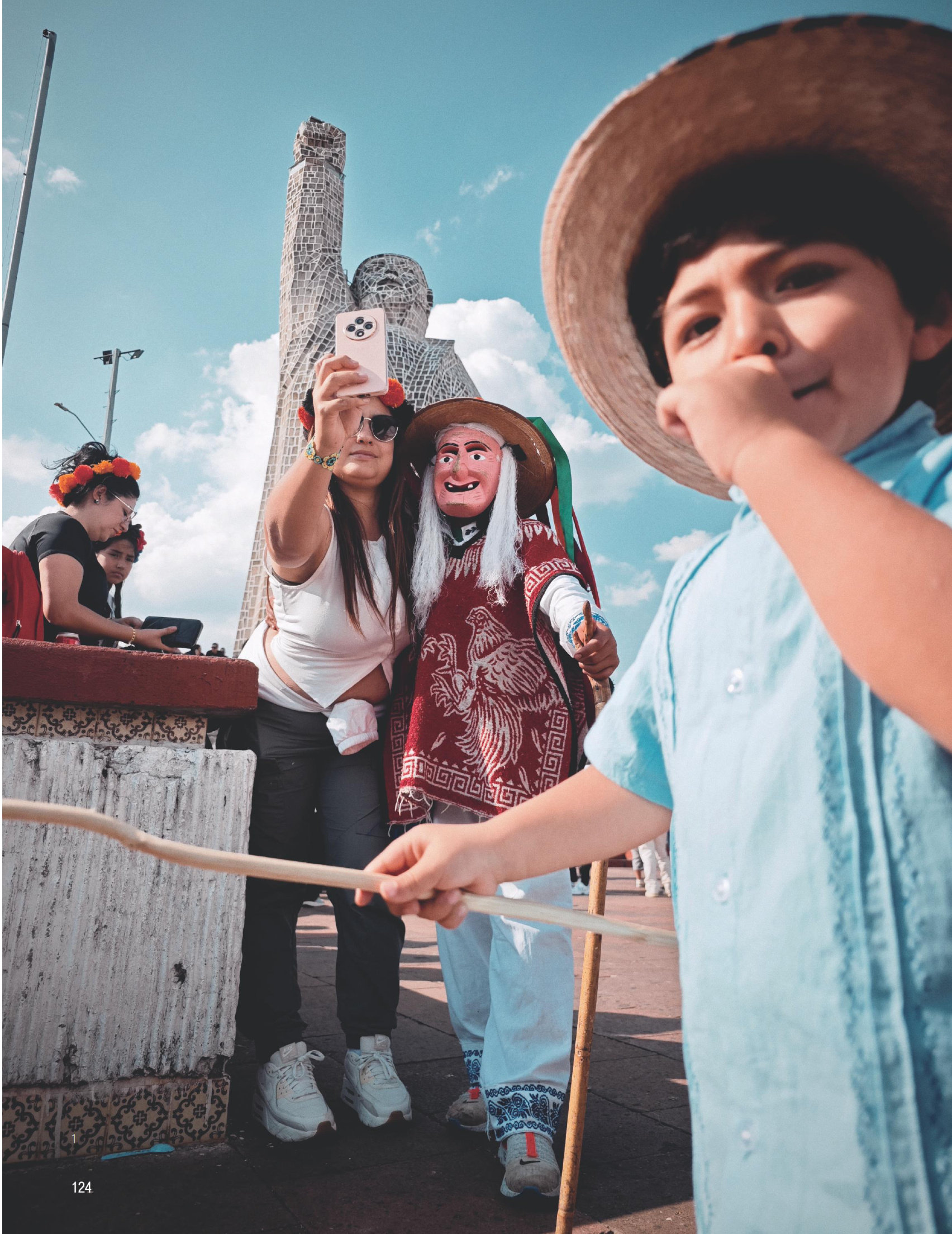 前不久,我开启了拉丁美洲之行,第一站我选择在墨西哥拍摄,那是一个古老而神奇的国度。无论远古文明还是今世民俗,墨西哥都呈现出令人着迷的气息。本期我们结合图片聊聊怎样用镜头去探索神祇之境、打量尘世舞台。 1《在山顶》 哈尼齐奥(Janitzio)是帕茨夸罗湖中一个布满民居、商铺和墓地的小岛,乘船登岛拾级而上直至山顶,广场上聚满游客:观景的、休息的、打卡自拍的等等。蹲下来采用低机位拍摄,将巨