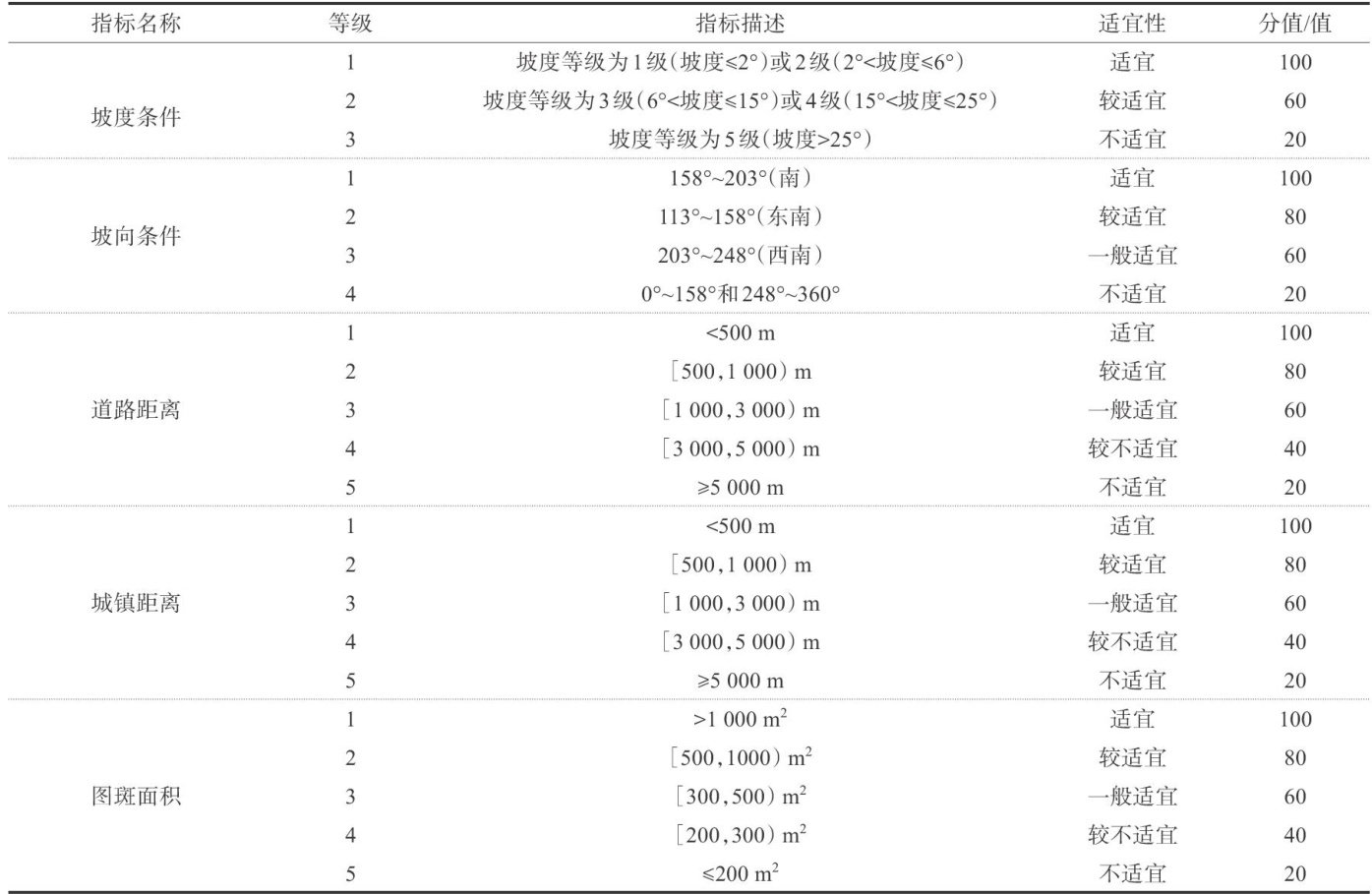 摘要:在全球能源转型与“双碳”目标背景下,闲散土地光伏开发成为兼顾可再生能源发展与土地资源高效利用的重要途径。该研究以某市为例,针对当前该市闲散土地光伏开发中存在的评价标准缺失与资源浪费问题,构建包含地形坡度、坡向条件、交通便利度、城镇距离及图斑面积在内的多维度适宜性评价体系,通过专家赋权法确定各项指标权重(坡度与坡向各占 25% ),并基于GIS空间分析实现量化分级。结果表明:该市 72.3% 的闲散土地(面积为68 058.01hm2. )具备1\~3级开发适宜性,理论上可支撑 37.8GW 光伏装机,其中1级(综合评分 ? 90)优质地块面积为 17437.91hm2 ,主要分布于坡度平缓、南向坡且邻近基础设施区域。基于此,该研究提出建立动态“光伏用地潜力库”与智能管理平台的建议,通过融合国土空间规划数据与机器学习技术,为乡村振兴背景下闲散土地的科学开发提供差异化决策工具,并为政策制定者优化光伏用地管理提供技术支撑。