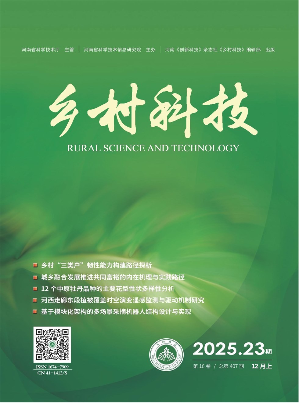 《乡村科技》是经国家新闻出版署批准,由河南省科技厅主管,面向国内外公开发行的一本优秀农业科技刊物,荣获2013年度河南省自然科学一级期刊。本刊主要栏目有:三农论坛(管理、综述、推广、教育)、农业经济(经济类非技术文章)、园林绿化(林业、景观、绿化)、种植大观(种植技术、植保、瓜果蔬菜)、养殖技术(养殖技术、水产、渔业、兽医)、资源与环境(土肥、能源、水污染、气象)、农业工程(环保、信息化、农机)。
