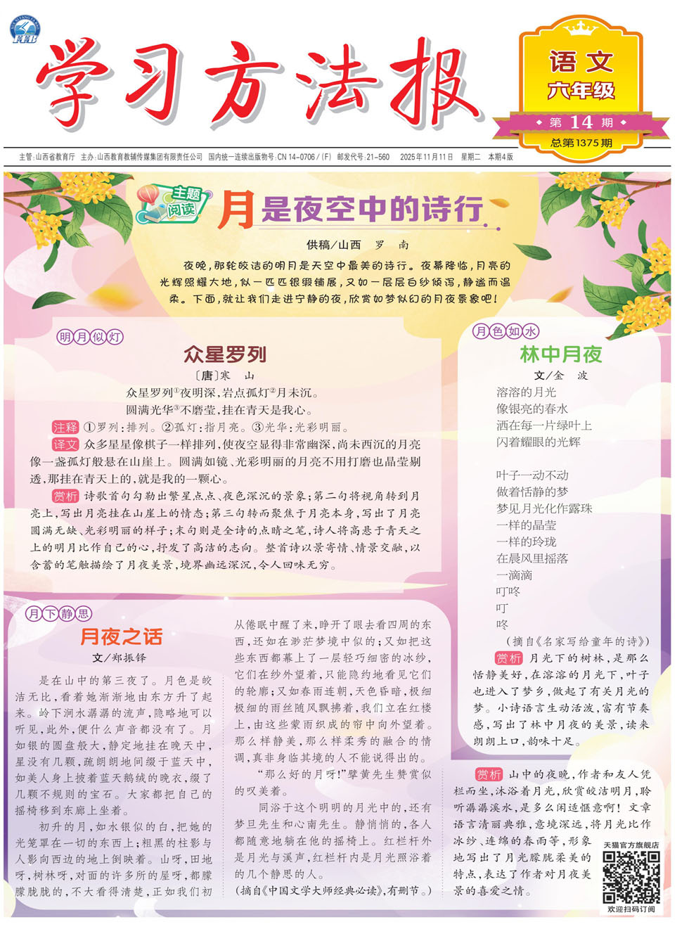 夜晚,那轮皎洁的明月是天空中最美的诗行。夜幕降临,月亮的光辉照耀大地,似一匹匹银缎铺展,又如一层层白纱倾泻,静谧而温柔。下面,就让我们走进宁静的夜,欣赏如梦似幻的月夜景象吧! 明月似灯 众星罗列 〔唐〕寒 山 众星罗列①夜明深,岩点孤灯②月未沉。 圆满光华③不磨莹,挂在青天是我心。 注释 ①罗列:排列。②孤灯:指月亮。③光华:光彩明丽。 译文 众多星星像棋子一样排列,使夜空显得非