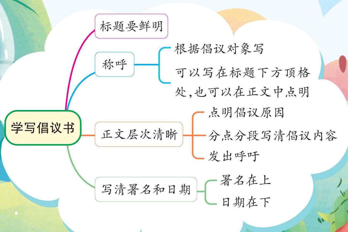 老师:同学们,如果你有一个想法希望得到大家的支持,并希望和大家一起去实施,那么你可以写一份倡议书。 乐乐:老师,怎么写倡议书呢? 老师:我们从课本中的范例《“节约用水”倡议书》可以看出,倡议书一般包括标题、称呼、正文、署名和日期这几部分。我们在写倡议书时要注意—— 一、标题要鲜明。课本中的《“节约用水”倡议书》,标题就明确地表达了倡议的主题是“节约用水”,让我们很清楚地把握了倡议的主要观点。