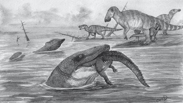 在美国发现的6600万年前的古牙齿表明,某些沧龙可能不仅在海洋中,也曾在河流中捕猎。科学家指出,这项研究可能是迄今首个沧龙在地狱溪捕食淡水猎物的证据。 研究人员在12月12日出版的《BMC动物学》上报告了这一发现。 沧龙是一种已灭绝的形似蜥蜴的爬行动物,体长可达12米。在这项研究中,荷兰阿姆斯特丹自由大学的Melanie During、美国东西弗吉尼亚社区与技术学院的Nathan Van