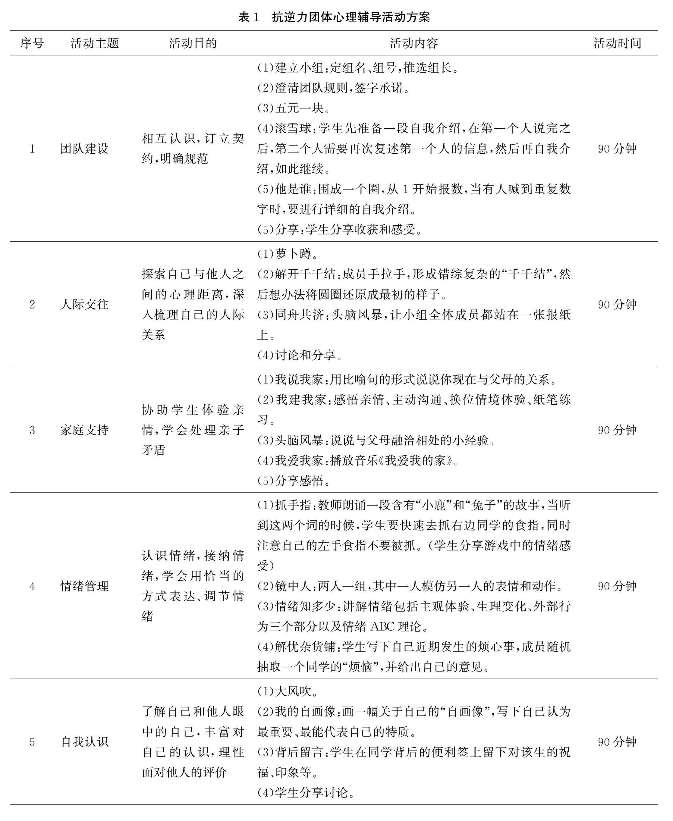 摘要:为考察团体辅导对高中生抗逆力干预的效果,本研究从学校招募62名高中生,随机分为实验组与对照组,每组31人。实验组运用团体心理辅导的形式进行抗逆力水平干预(共7次课,每周一次,每次90分钟),对照组不做任何处理,干预前后采用青少年心理韧性量表(RSCA)对两组进行测评。结果表明:干预前,两组学生的抗逆力总分及其各维度没有显著差异(p>0.05);干预后,实验组后测显示学生的抗逆力总分及其
