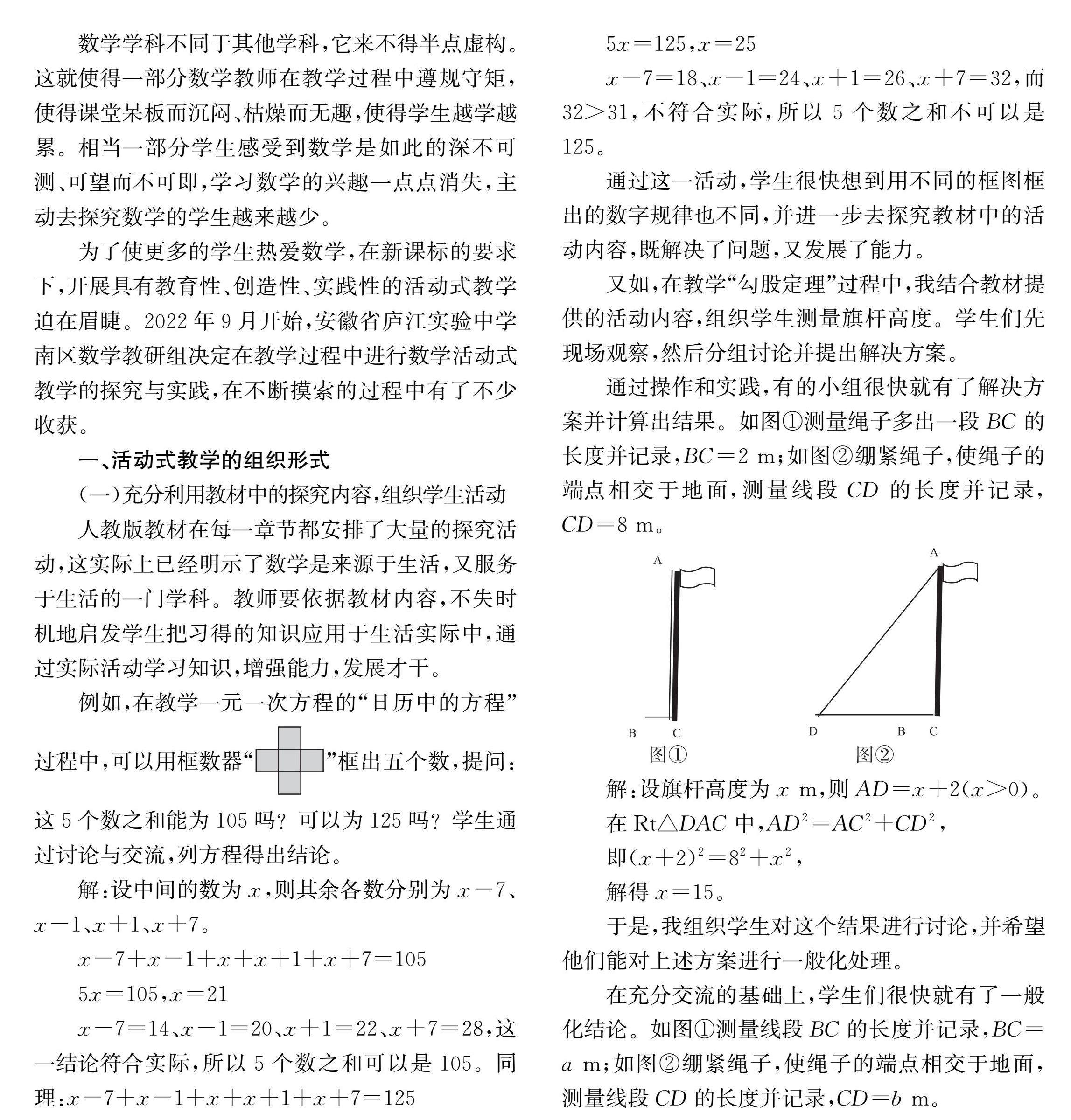 摘要:遵循新课标的要求,初中数学教师应积极开展活动式教学的探究与实践,促使更多学生热爱数学。基于此,本文从充分利用教材中的探究内容、合理利用生活中的数学实例等方面探讨了活动式教学的组织形式,指出活动式教学要加强有效评价,正确评价他人和自我。 关键词:活动式教学 数学活动 评价 数学学科不同于其他学科,它来不得半点虚构。这就使得一部分数学教师在教学过程中遵规守矩,使得课堂呆板而沉闷、枯燥而无