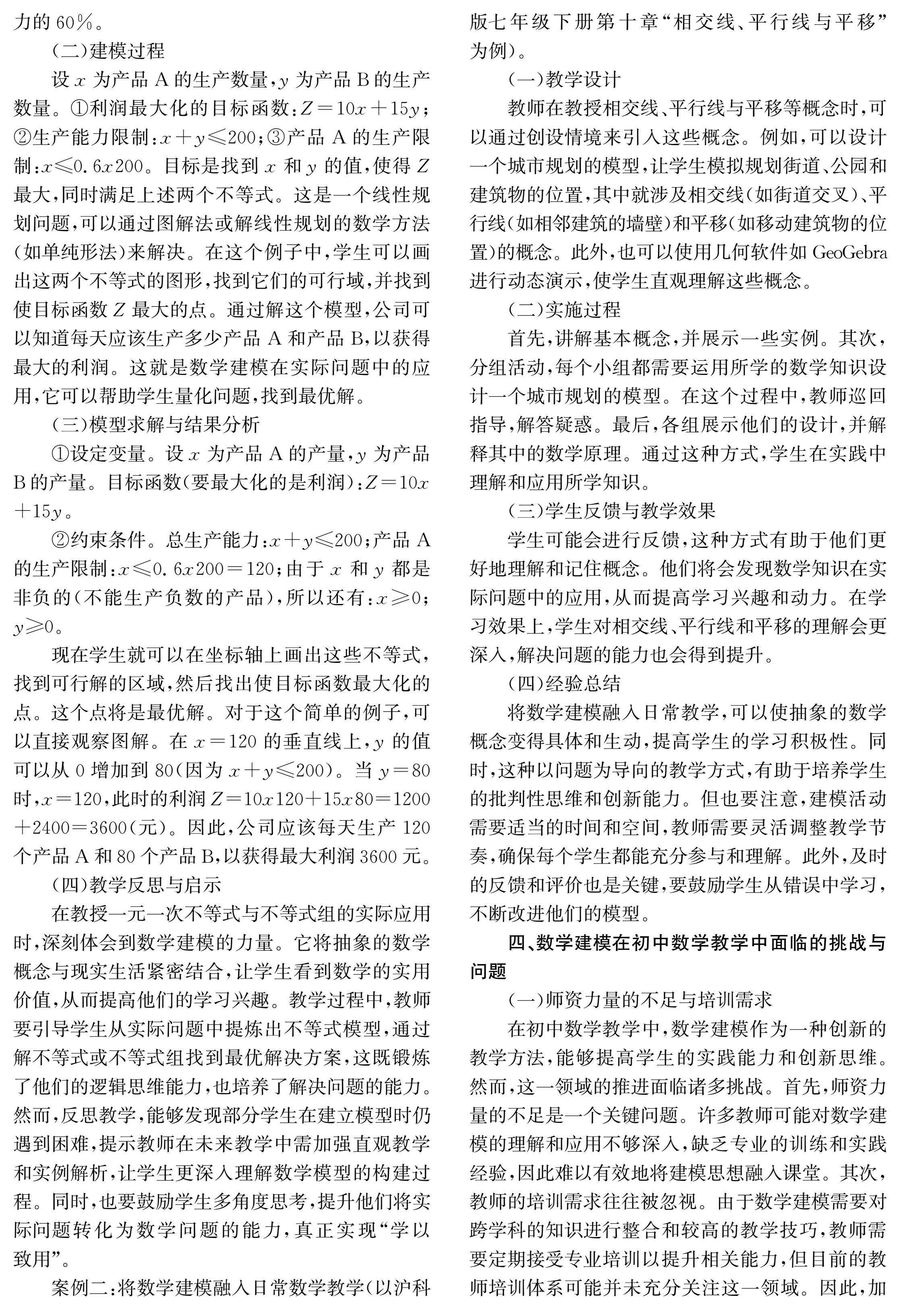 摘要:数学建模在初中数学教学中的实践与探索旨在提升学生的数学应用能力和创新能力。将抽象的数学概念与现实生活中的问题相结合,可以激发学生的学习兴趣,培养他们解决问题的实际技能。本文探讨了在新课改背景下,如何设计和实施有效的数学建模教学策略,包括创设情境、选择合适的建模任务、引导学生参与模型构建和求解过程。同时,本文还分析了教学实践中可能遇到的挑战,如学生对模型的理解难度、教师的专业素养提升等问题,并