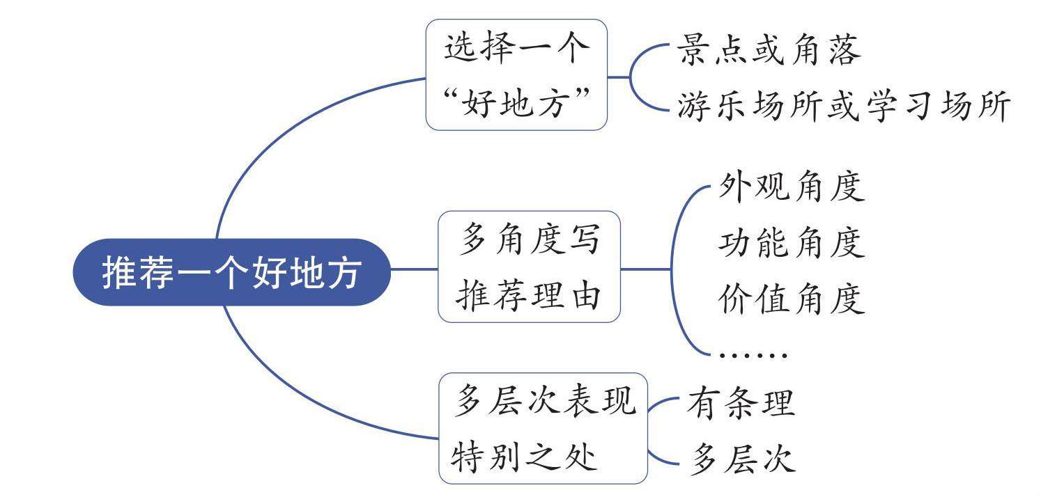 你可曾在静美的园林中让心灵回归自然,你可曾在安静的图书馆中尽情遨游书海,你可曾在热闹的游乐场里追逐朋友的身影?世界之大,总有一处地方值得我们去看一看。本单元的习作就要求我们推荐一个好地方。该如何推荐呢?一起来学习吧。 一、选择一个“好地方”。这里的“好地方”可以是某个景点,也可以是某个角落;可以是某个游乐场所,也可以是某个学习场所……不论是什么地方,它们都与众不同,令人向往。我们要回忆知道的这些