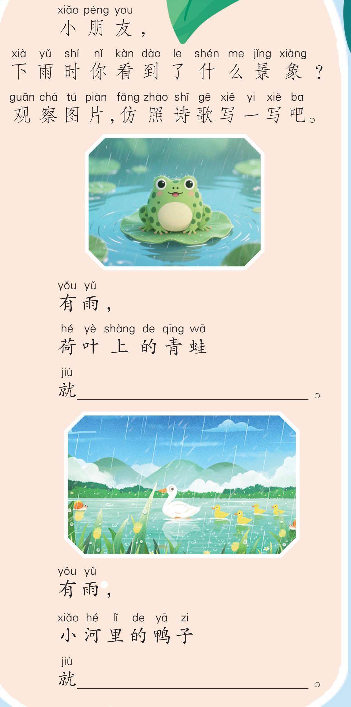 有yǒu雨yǔ, 我wǒ家jiā门mén前qián的de小xiǎo河hé 就jiù欢huān快kuài地de笑xiào了le。 有yǒu雨yǔ, 我wǒ家jiā院yuàn子zi里lǐ的de树shù 就jiù一yì棵kē棵kē都dōu胖pànɡ了le。 有yǒu雨yǔ, 我wǒ家jiā后hòu面miàn的de山shān 就jiù不bù老lǎo了le。 有yǒu雨yǔ, 我wǒ们m
