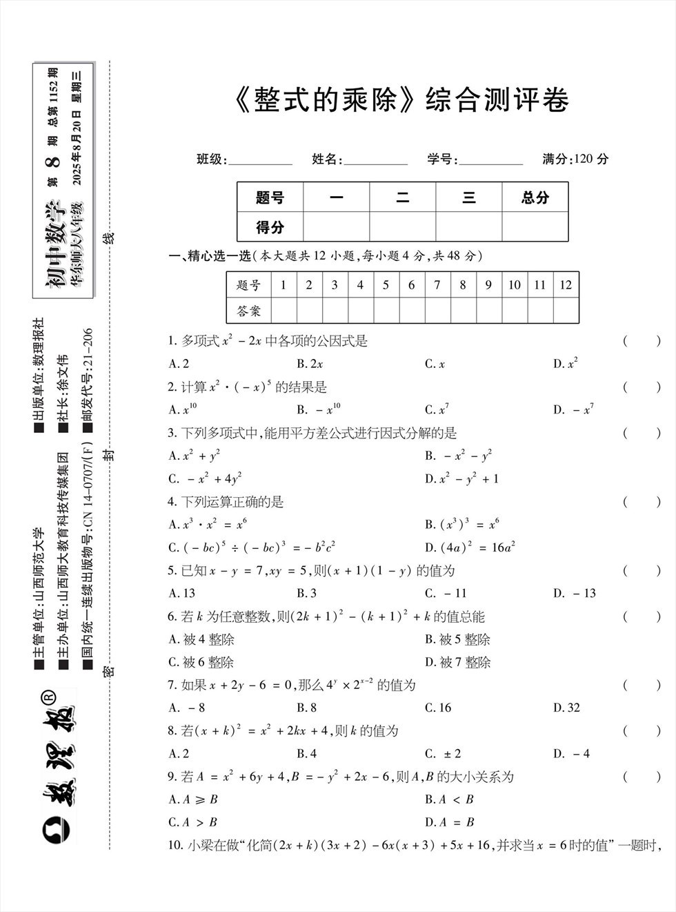 《数理报》是由山西省教育厅主管,山西师范大学主办,面向全国发行的中小学生理科教学辅导类报纸
