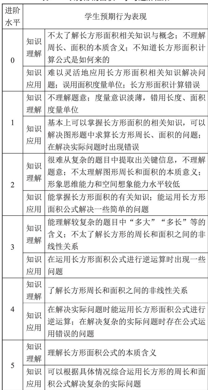 摘要:学习进阶理论倡导教师以学生现有的知识结构和认知水平为基础,采用适当的方式引导学生积极参与教学活动,促使学生获得进一步发展,实现课程、教学与评价的一体化。此理论契合新课改理念,可以作为小学数学教学的指引。在其指引下,教师应运用恰当的方式确定学生的现有水平,并据此设计教学目标、建构教学活动,促使学生“跳一跳摘到桃子”。基于此,文章以“长方形的面积”一课为例,从进阶起点、进阶过程和进阶终点这三个阶段着眼,详谈了学习进阶理论下的小学数学教学策略,以供参考。