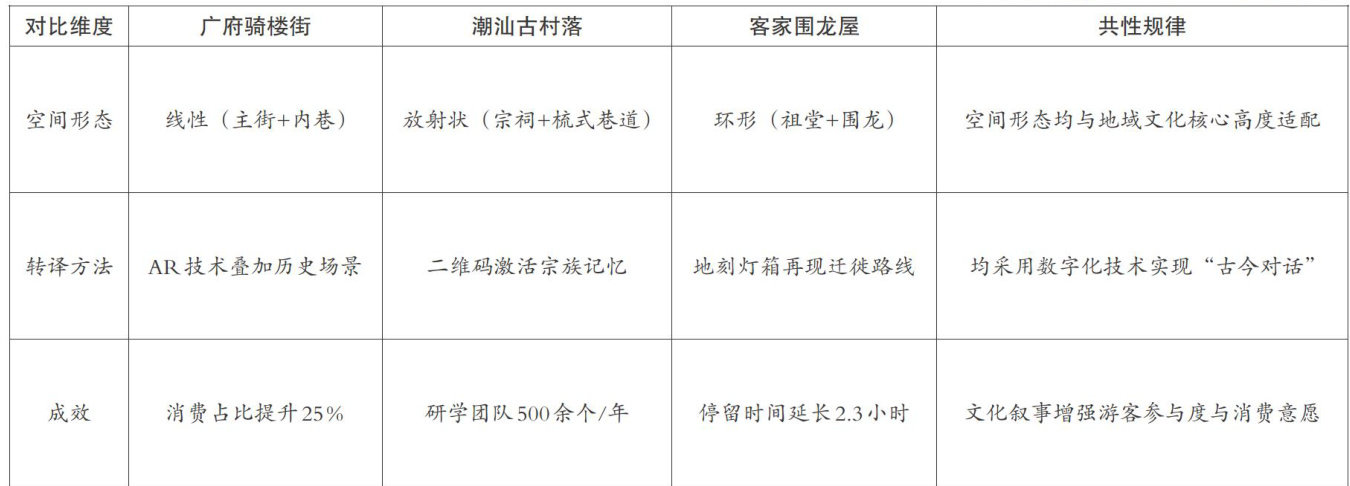 摘要:中国传统城市肌理研究大多集中在形态描述及类型划分上,对于文化内涵与空间结构之间复杂而微妙的互动机制,目前尚缺乏全面且深入的系统性探讨。借鉴形式语法和空间叙事理论,以广东历史城区为例,分析其街道网络体系和商业活力演变,构建“符号解构—规则生成—叙事落地—文旅重构”四阶融合框架。通过对比城市的叙事格局,提炼岭南骑楼街、潮汕古村落、客家围龙屋的空间语法规则,形成岭南文旅融合的语法创新路径,为地域文化赋能文旅融合提供可操作的理论工具和实践路径。