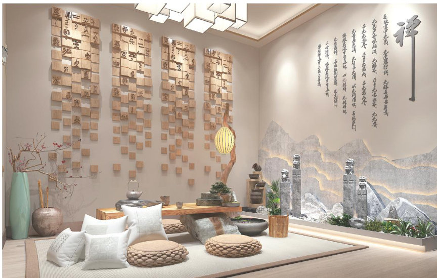 作者简介: 谭美凤,硕士,讲师。研究方向:环境与装饰艺术设计。 山静云归茶室空间 “水羽轻鸣”系列彩盘装置 狮舞华彩